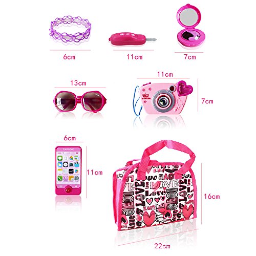9 PCS AWESOME ACCESSORIES: Our My First Purse includes a bunch of items for in-depth pretend play, including a play cell phone, a light up car key, a pair of pretty glasses, a play camera,2 bracelet, a pretend compact and a lipstick, as well as a pink storage bag.