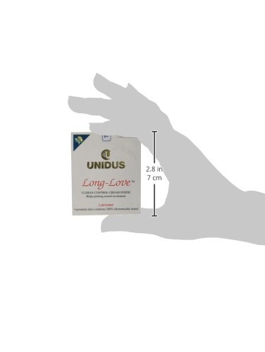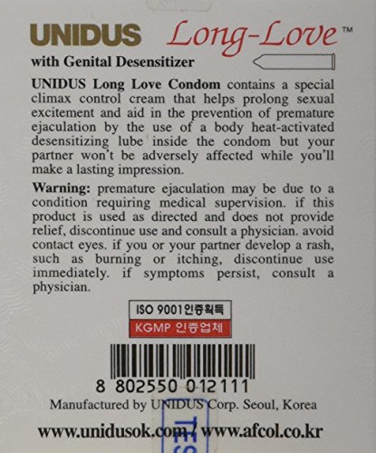 A new product. US-FDA approved. Can EXTEND YOUR LOVEMAKING FOR HOURS. Every normal man dreams of just once putting on a performance beyond the wildest expectations and imaginings of his partner. Dream no more! Extend your lovemaking for hours with these new products! The Long Love Condom is furnished with an ejaculation retarding paste which is free of fat and is applied to the inside of the condom. The paste liquifies at body temperature and quickly spreads over the entire inner surface of the condom. After cohabitation the substance can easily be rinsed off with water. Your partner will be amazed at the new lover she has discovered overnight and all weekend long! ITEM: LATEX PROPHYLACTICS (CONDOM) Natural White, Plain Type, Lubricated. Climax control lubricant inside (Desensitizer). BRAND: UNIDUS LONG LOVE CONDOMS.