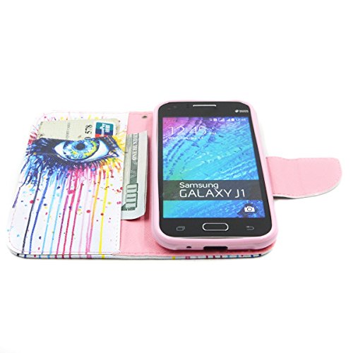 -. Feature : Dual Layer weiche Innendeckel und PU Leder außen schützt Ihr Mobiltelefon vor Kratzern Schmutz und Abnutzung perfekt / Der Fall ist für besondere Anlässe, wo Sie um Ihr Handy, Kreditkarten und Bargeld in einem leichten Brieftasche behalten wollen / Alle Tasten und Kamera sind leicht zu erreichen und zu verwenden, passen Sie Ihr Telefon wie ein Handschuh / Sie können ihn aufzustehen so ist es einfach, um den Bildschirm und Video zu sehen / Paket: 1x Samsung Galaxy J1 Ledertasche,1x schwarzen Metall Stylus,1x bling Anti Staub Stecker