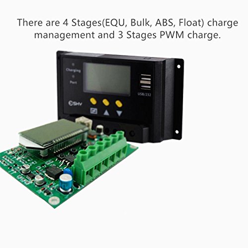- POWER CONFIGURATION: Max 30A 12V/24V 360W/720W, the power rate is conveniently adjustable with the dual USB port on the front of the regulator. There are 4 Stages(EQU, Bulk, ABS, Float) charge management and 3 Stages PWM charge.