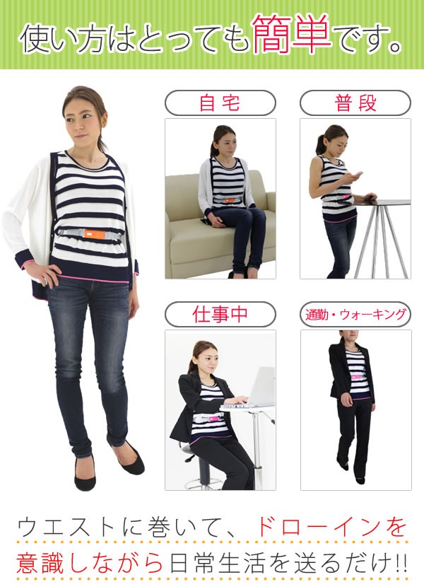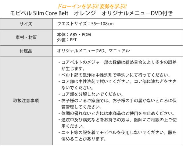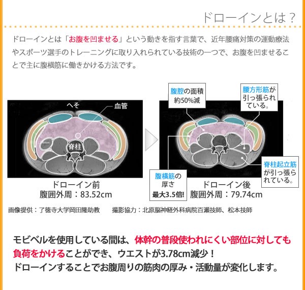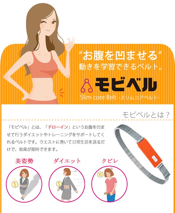 | モビベルは「ドローイン」というお腹を凹ませて行うダイエットやトレーニングをサポートしてくれるベルトです。日々のエクササイズやトレーニングでなかなか成果がでない方や、まんまる猫背を治したい・引き締まったくびれを手に入れたいとお悩みのあなたにオススメです。ウエストに巻いて、日常生活を送るだけ。「ドローイン」を学んで、美姿勢を手に入れよう!! |