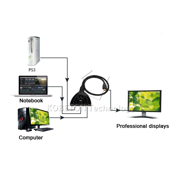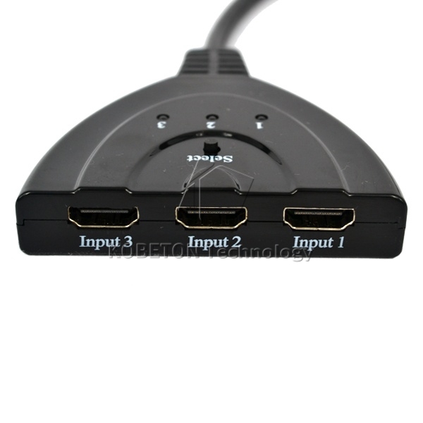 between three HDMI sources such as DVD players, game consoles, and more. When one device is turned off, the pigtail switcher will automatically select the next device, or you can manually select with the button