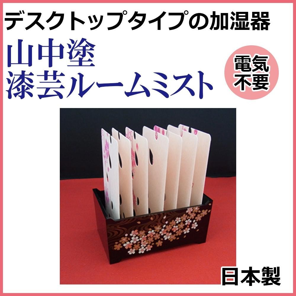 山中塗の容器に美しい蒔絵が施されたインテリアとしても素敵な加湿器です。フィルターは柄付き4枚と無地3枚の7枚セットで、繰り返しご使用いただけます。電気不要で、機械音もないので静かです。インテリアとしてのご使用にもおすすめです。 |