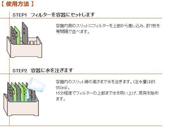 | 仕様 | ●加湿方式:自然気化式 ●注水量:約550ml ●使用期間(目安):約4ヶ月 ※使用状況により変わります。 ●加湿範囲(目安):周囲約1m(ルームミスト(加湿器)1台利用の場合) ※一日の最大加湿量は約180ml |