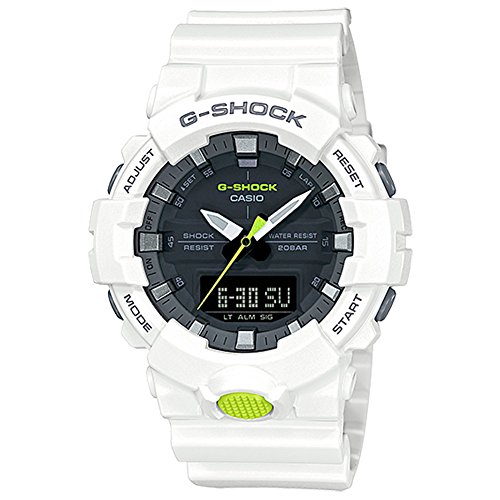 Casio G-Shock Mid-Size Analog Digital 200M Super illuminator Watch. At the touch of a button, the display can be brightly illuminated in a fashionable color. Shock-resistant construction protects against impact and vibration. A second location time can be set and called up. Ideal if you frequently make overseas calls. Stopwatch function - 1/100 sec. - 24 hours. The countdown timer emits a signal after a preset period of time has elapsed. The watch has a maximum timing capacity of 100 minutes and can be set in second-long cycles. 5 Daily Alarms- the daily alarm reminds you about recurring events with an acoustic signal at the time you have set. This model has 5 independent alarms for flexible reminders of important appointments. The button tones for using the mode button can be turned off. This means that the watch no longer beeps when switching from one function to another. Preset alarm or countdown timers remain active when the button tones are deactivated. Hand moving Feature- With a push of a button, hands are moving and permit a free visibility of functions like stopwatch or date. 12/24-hour timekeeping- Times can be displayed in either a 12-hour or 24-hour format. Automatic calendar- Once set, the automatic calendar always displays the correct date.
