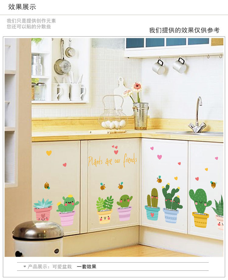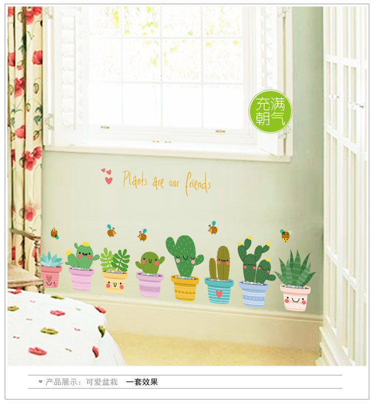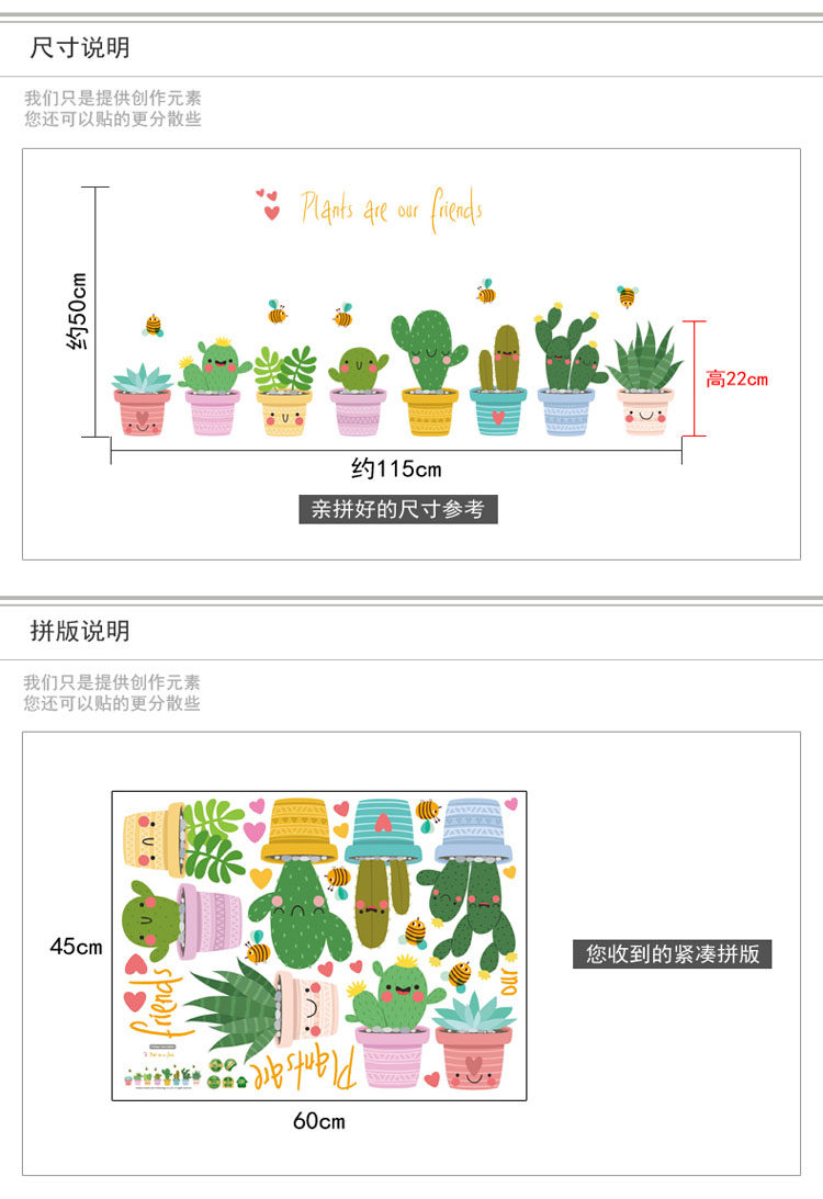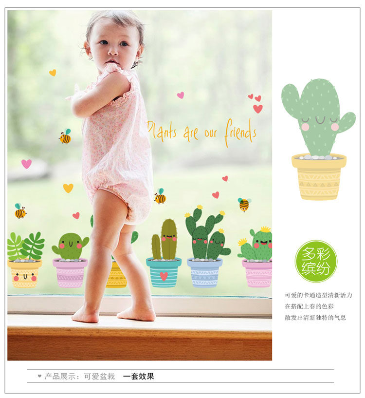 墙贴 仙人掌多肉盆栽蜜蜂可爱植物花卉贴画客厅店铺橱窗装饰贴纸