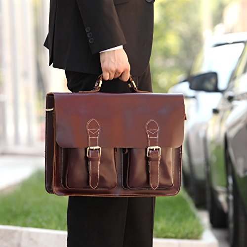 This large briefcase is made of 100% full grain genuine leather with cotton as interior lining and combining with brass fitting. Leathario offers specially designed totes with a removable sleeve for your laptop. The sleeve is easily detached from your case and can effortlessly slide back into your case. It is plenty large enough to store you laptop, documents, files, books etc. Front flap with double buckle fastenings is great for quick-access items. Carrying handle is on the top of the flap. The shoulder straps are adjustable and removable. Leather handle has been streamlined for hand comfort. There are 1 comfortable shoulder pads and 2 security straps with buckles.