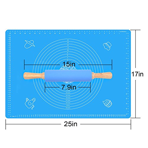 GREAT VALUE: Pack of 2. 1 x Nonstick rolling pin measures 7.9 x 2.1" (handle to handle measures 16x 2.1"). 1 x Large pastry mat with measurement of 25 x 17". Large enough for your baking.