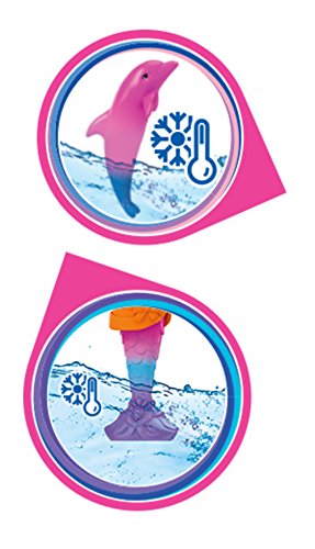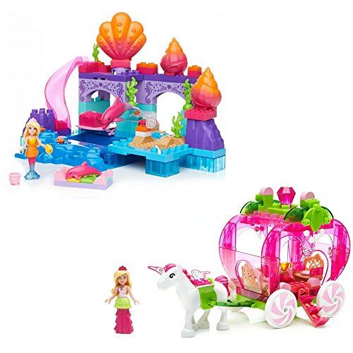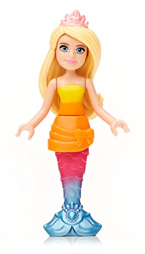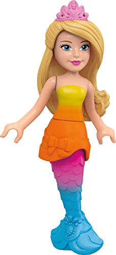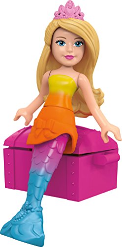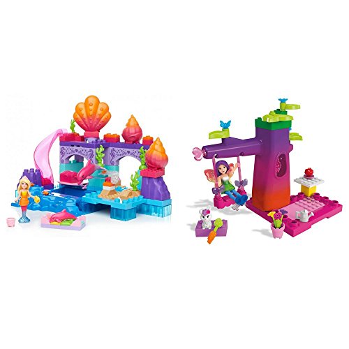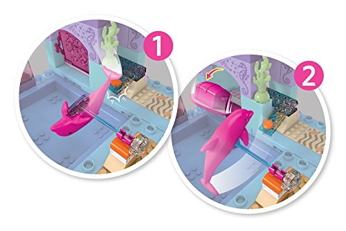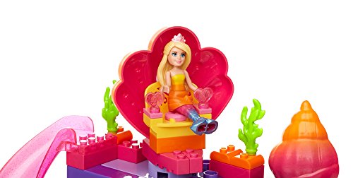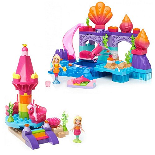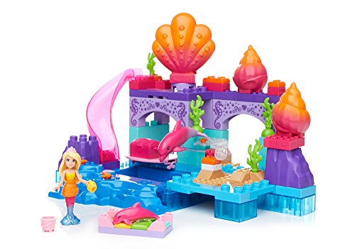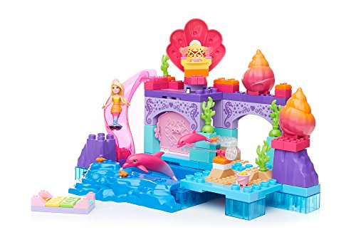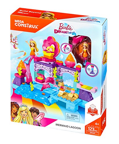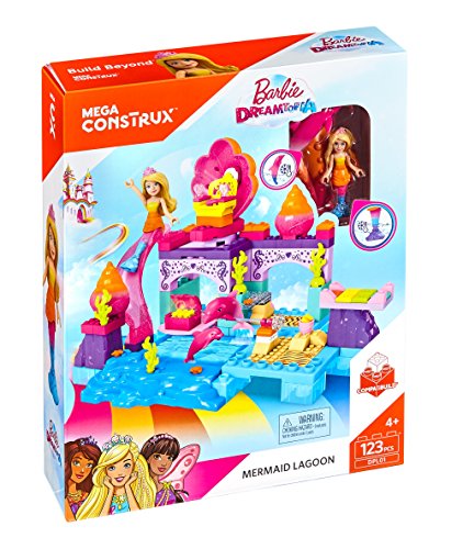 Make a splash in Dreamtopia with the Mermaid Lagoon by Mega Bloks Barbie! This mermaid-themed lagoon features multiple play areas to build for this Barbie figure and her dolphin friends! Fill the pool with water and make waves when you glide down the waterslide! When this magical Mermaid Barbie figure jumps from her spinning seashell chair into the pool, her tail changes color — and so does the mommy dolphin! Spin the handle to make the mommy dolphin jump and she will uncover a secret treasure chest that opens to reveal sparkling treasures inside! The set includes one Mermaid Barbie mini fashion figure with water-activated mermaid tail and mermaid-themed accessories, and two dolphin friends. Build a magical make-believe world in Barbie Dreamtopia!Idea for ages 3 and upFeature