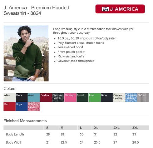 Studio : J America Publisher : J America Product Description This J. America suede hoodie is 9.75 oz., and made of 80% cotton and 20% polyester. It features a front pouch pocket and ribbed waist and cuffs. Also includes a poly-filament cross-stretch fabric and a jersey lined hood. 0