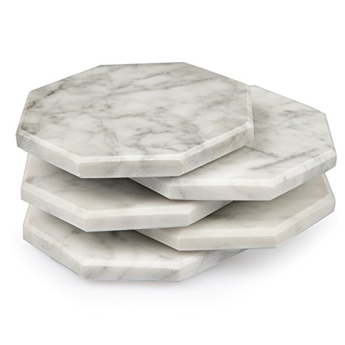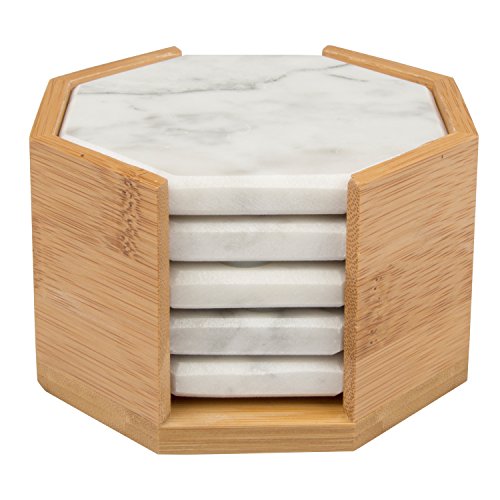 White Carrara Marble Coasters with Bamboo Holder, Set of 5