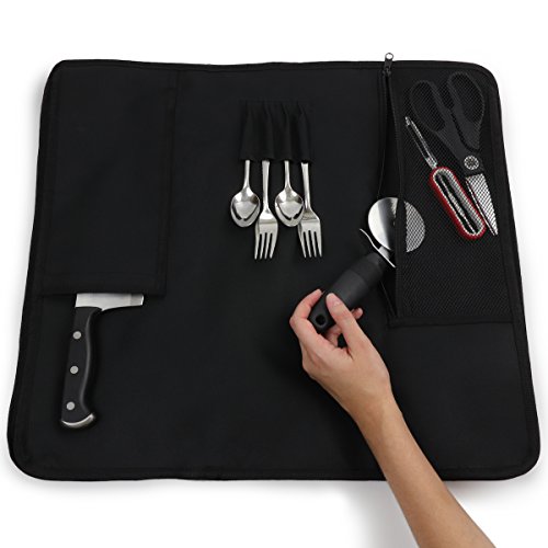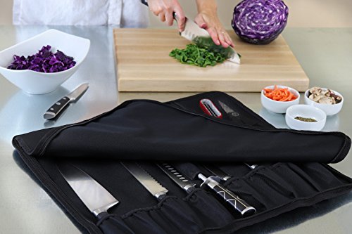- HOLDS WIDE ASSORTMENT OF KNIVES AND TOOLS– Knife roll has 8 slots for knives ranging from paring knives up to 18” knives plus a covered slot for your knife sharpening steel, 4 slots for tasting spoons, AND a zippered pouch for extra tools! KNIVES/TOOLS NOT INCLUDED.