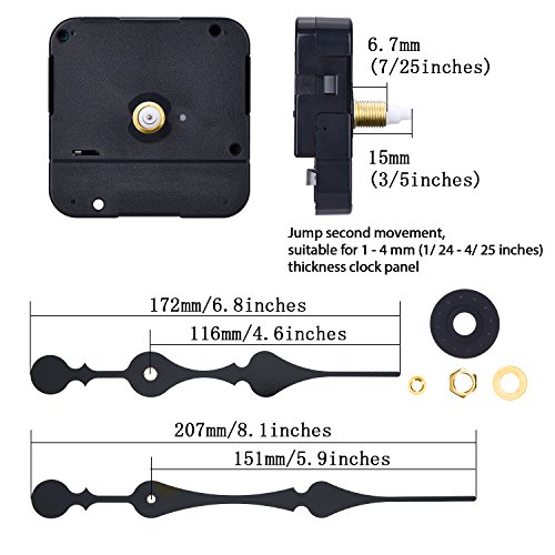 Size: total shaft length: 15 mm (3/ 5 inch); Thread length: 6.7 mm (7/ 25 inch); Jump second movement, suitable for 1 - 4 mm (1/ 24 - 4/ 25 inch) thickness clock panel
