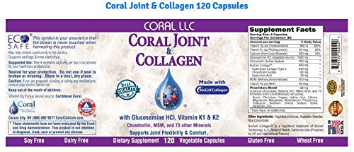 BioCell Collagen® and Glucosamine HCI with Vitamins K1 & K2 to support joint flexibility and comfort*. An advanced formula featuring ingredients crucial to the maintenance of joints, Coral Joint & Collagen combines BioCell Collagen, Glucosamine HCI, Chondroitin, MSM and a host of other important vitamins and minerals to target specific functions related to healthy movement. Veggie capsules offer 400 mg of BioCell Collagen, a clinically-tested dietary ingredient that may help promote active joints and healthy connective tissues, among other benefits*, and 1,500 mg of Glucosamine HCI, a key building block of cartilage-the "cushion" that surrounds the joints. Coral Joint & Collagen also adds vitamins K1 and K2, essential for healthy arteries and bones, and Coral's proprietary blend of 74 bio-available coral minerals.Feature