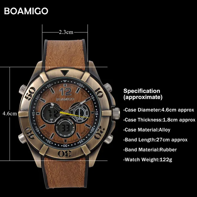 남성 듀얼 디스플레이 스포츠 시계 아날로그 디지털 LED 석영 시계 207 BOAMIGO 브랜드 선물 clockRetro 빈티지 펑크 시계 키 포인트: 1. 기능: 듀얼, 알람, stopwatches, 크로노 LED 빛, 날짜,, 달 2. 유형: 남성 스포츠 시계 3. 운동: 아날로그 디지털 듀얼 디스플레이 4. 스트랩 재질: 고무 5.30 메터 방수 6. 정확한 시간 7. 최고의 선물 크리스마스, 새해 생일 및 특징: 케이스 직경: 4.6 센치메터 약 케이스 두께: 1.8 센치메터약 케이스 meterial: 합금 밴드 길이: 27 센치메터 약 시계 weigth: 122 그램 밴드meterial: 고무