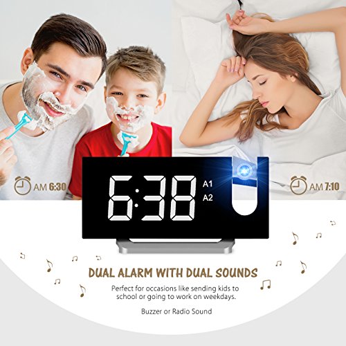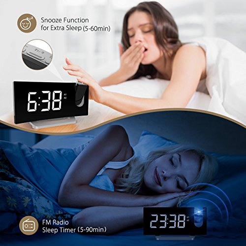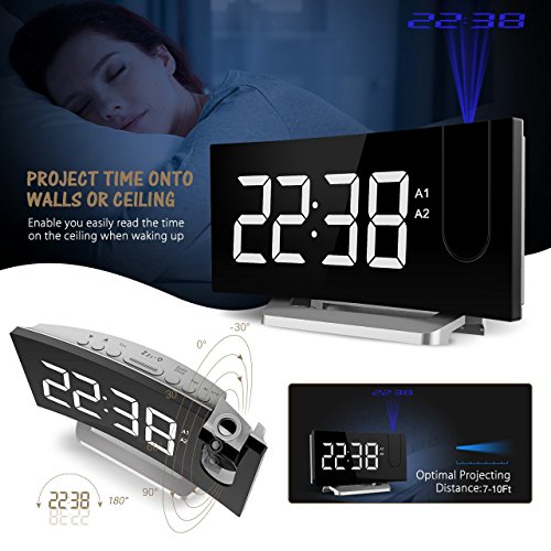 Project Time onto Walls or Ceiling. The projector on the top projects big and clear numbers onto walls or ceiling. It enables you easily read the time on the ceiling rather than twisting around to see the clock when you lying in bed. The blue ceiling projection light is soft and non-disturbing. The time direction can be adjusted 120° and the optimal projecting distance is 2-3m/80-12in.