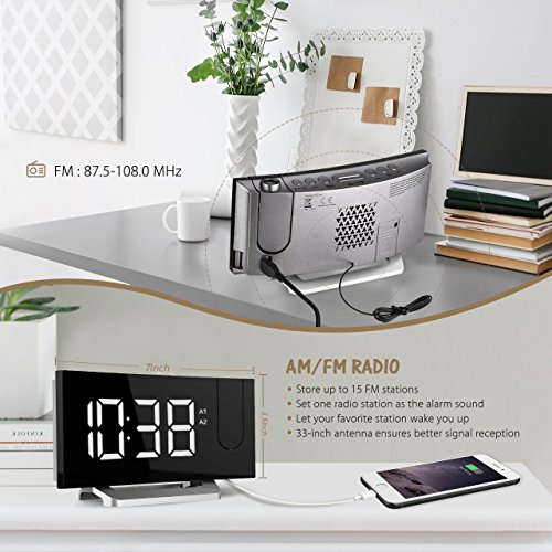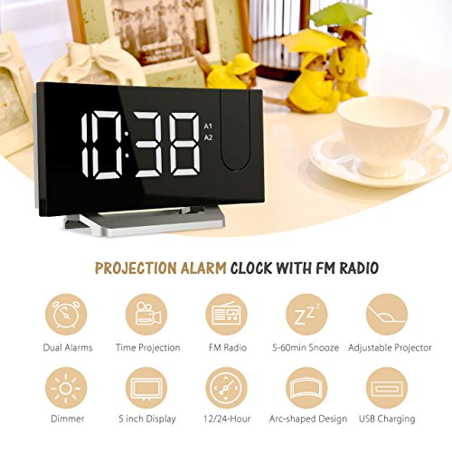 This compact clock fits perfectly in your night table or office table and it does not occupy much space. It offers time display, time projection, USB charging port, dual alarms, snooze, FM radio, radio sleep timer, and other features.