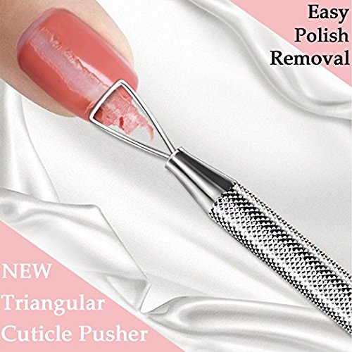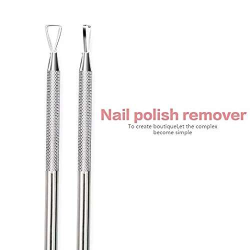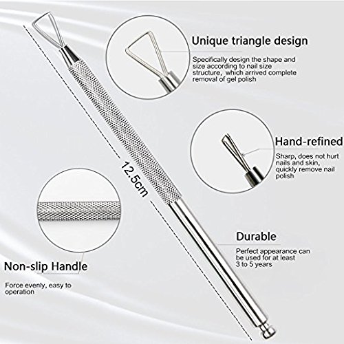 Top-Rated and Cheaper Cuticle maintenance tool! Some of cuticle remover tools do damage to your nail, make your nail become rougher and thinner, even pain to use. 100% Stainless Steel cuticle pusher is quite different from them, it has an excellent and creative triangle design. So relax and comfortable to get rid of gel polish without causing damage to sensitive skin, no traces on your nail surface, smoothly as ever. Specifications: Color: Silver Net Weight: approx. 21g Length: approx. 12.5cm×0.6cm Material: Stainless steel Features: Triangle design for the perfectly remove the polish on your nail Non-slip design handle, very easy to use Suitable for home use and professional use Usage: 1. Sand the gel nail with nail buffer or nail file. 2. Wrap your nail with pro nail polish remover with 5 to 8 minutes. 3. Scrape the soft gel nail polish from the forefront of the nail to the tip of the nail. 4. Wipe the nail clean with nail brush. 5. Apply nourishing oil to the edges of nails to moisten nails. Tips: 1. Use this tool after you soften the nail polish. 2. Do not carve on the hard surface back and forth or push hard on triangle pusher, to avoid damaging the scrap head. 3. Wipe the tools clean after use, keep it well. Packing included: 1 x Nail Art Polish Remover 0