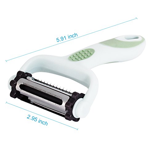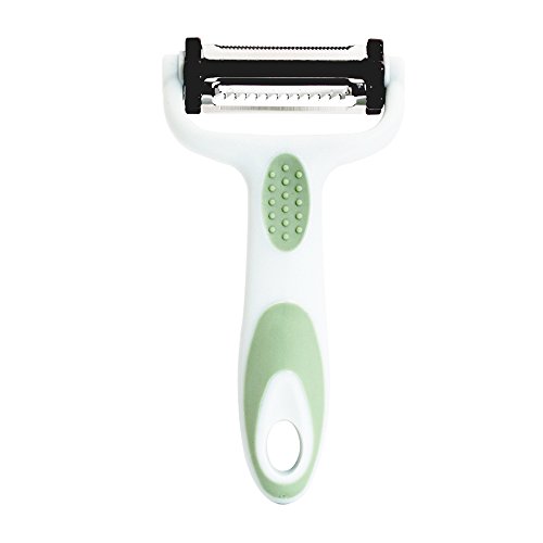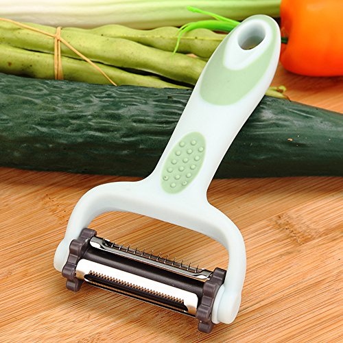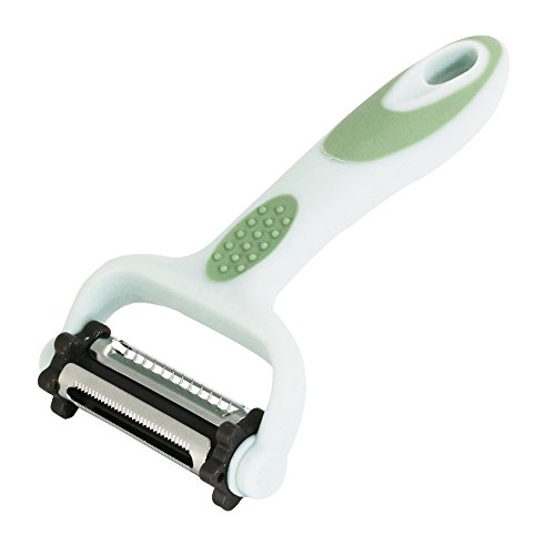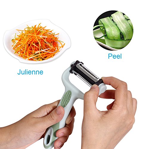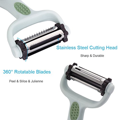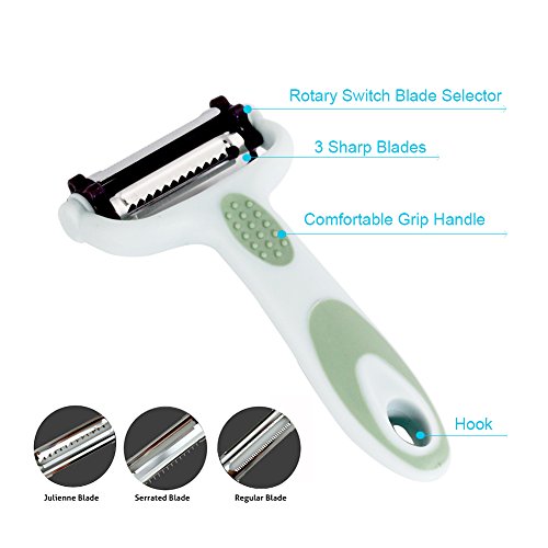 - 3 IN 1 ROTATING BLADES- Multi-Function Peeler with 3 choice (serrated, julienne and regular) of stainless steel blades.