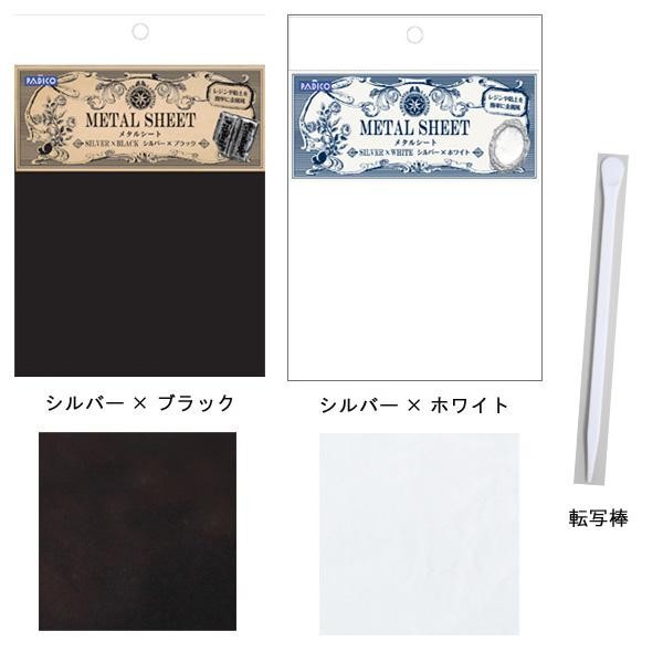レジンや粘土など、シールが貼れる素材ならなんでも金属風に仕上げることができるメタルシートです。貼って削る、お手軽仕様です!! 製造国:日本 素材・材質:アルミ箔 商品サイズ:120×150mm セット内容:(メタルシート1枚、メラミンスポンジ(磨き材)1個、転写棒1本)×5個 ※サプライヤー直送品  ご注文後2~3営業日後の出荷となります【商品名】PADICO パジコ メタルシート 5個セット シルバー×ブラック