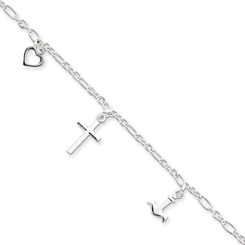 Faith, Hope and Charity are the Christian virtues of believing the incredible, hoping when all is lost and forgiving the unpardonable. Created from polished sterling silver, this fancy cable style chain measures 2mm in width, 10 inches in length and fastens with a fancy lobster clasp. Approximate charm sizes, 6mm heart, 7 x 14mm cross and 7 x 10mm anchor.Feature