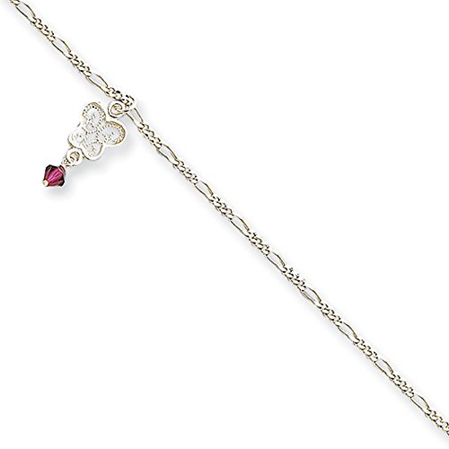 A beautiful sterling silver butterfly accented with a dark pink crystal enhances this 2mm width, 9-inch long, Figaro chain that secures to your ankle with a spring ring clasp. The dangling charm is set into motion with each step you take reflecting light and color wherever you go.Feature