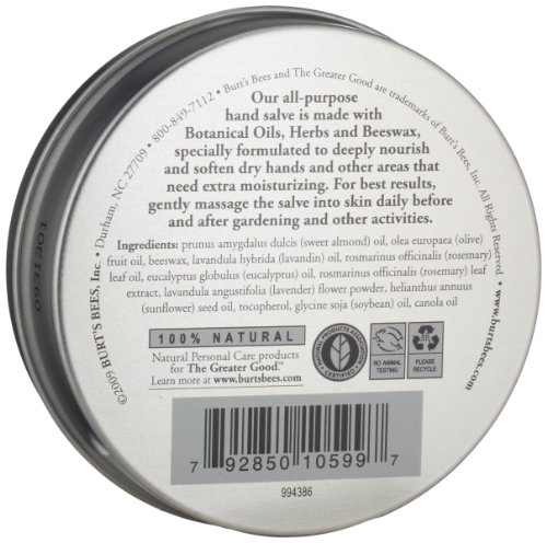 - Feature : 0.30 ounce travel size tin of 100% natural Hand Salve / Beeswax and botanical oils help rough, dry hands / Herbal scented hand care / Perfect for both men and women / Classic hand salve from Burt?s Bees