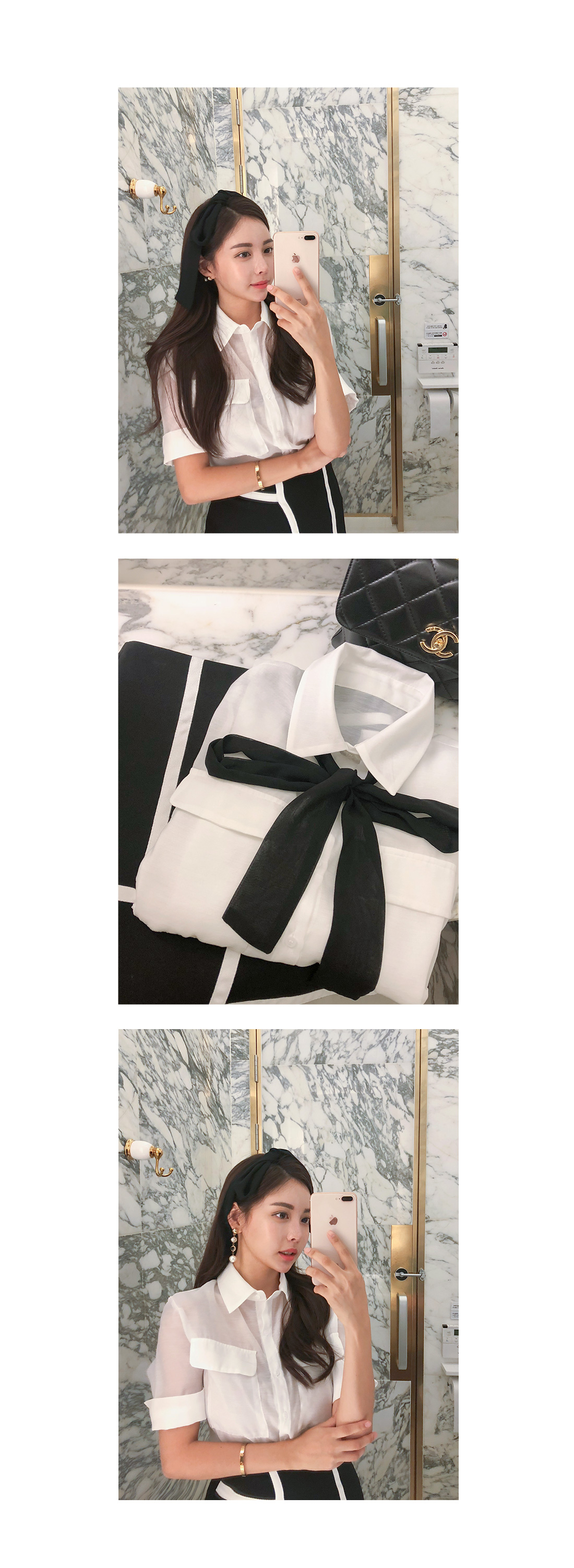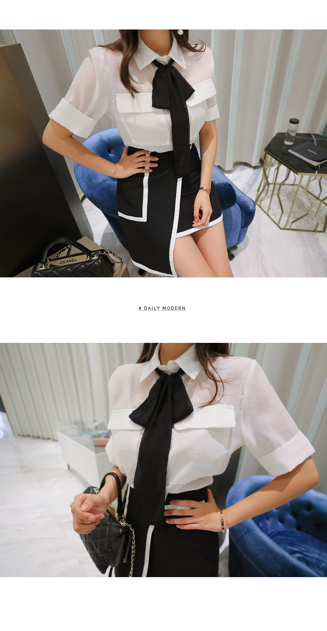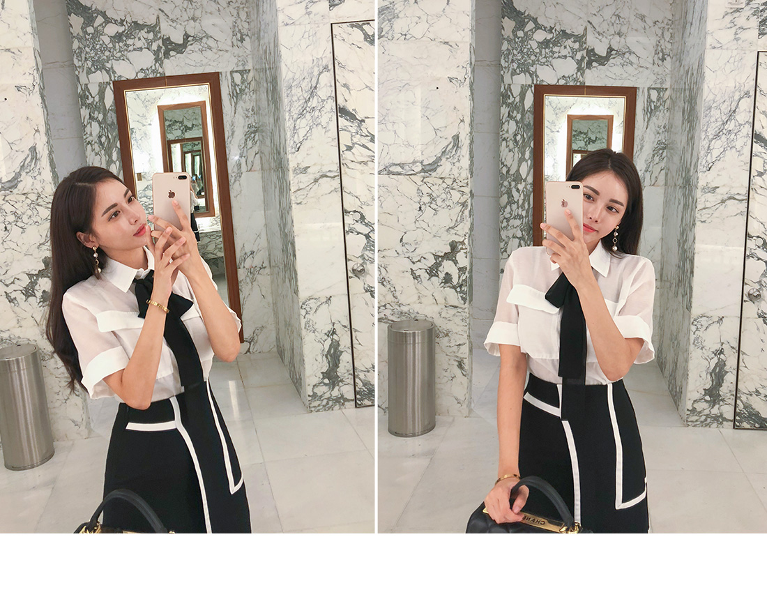 MD COMMENT고급스러운 분위기로 여성스러운 블라우스랍니다.베이직한 셔츠 카라 디자인에 반팔 소매 기장으로 제작되었는데요.여유있는 핏과 기장감으로 부담없이 편안하게 즐기기 좋아요.전체적으로 은은하게 비치는 시스루 소재감으로 은근히 섹시한 무드를 가져갈 수 있구요.바스트 부분에 양쪽 포켓을 주어 실용성을 챙겨주었으며소매 밑단의 롤업 디테일이 더해은은한 포인트를 더해 밋밋함을 없애 주었답니다.블랙 타이가 세트상품으로 따로따로 활용할수 있으며카라에 리본으로 묶어 스타일 연출 해주시면 좋아요.러블리한 포인트를 가져갈 수 있으며 함께 구성 된 리본은 탈,부착이 가능하니 참고해주세요!가벼운 소재감으로 S/S시즌 시원하게 즐기기 좋구요.군더더기 없이 깔끔한 디자인으로 데일리룩, 데이트룩, 하객룩 등 다양한 룩에 은근 세련된 포인트를 연출해 줄 아이템으로 추천할게요!프론트부분 단추로 클로징을 도와드리구요.정사이즈로 함께해주세요 :)COLOR/SIZE아이보리,베이지FREEMODEL FITTING아이보리/FREE