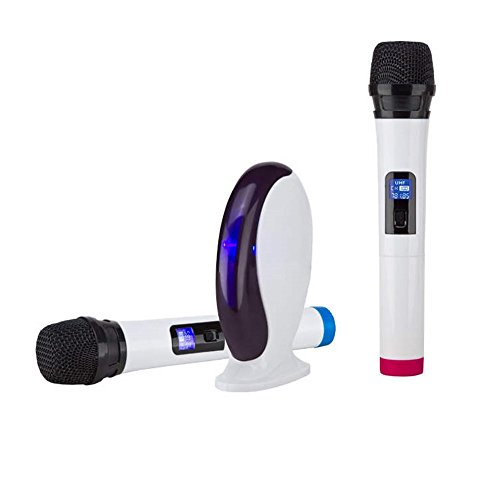 -. Feature : WIRELESS & LONG OPERATION RANGE WITH UHF: Wireless microphone system amplifies your voice clearly while enabling a free movement, up to 165ft/50m for operation by UHF band frequency 750MHz-850MHz, fixed frequency, less diffraction, larger range, higher penetration ability and more stable on signal transmission, suitable for space with obstacles / MULTIFUNCTION: ①The wireless microphone system could work as part of Karaoke machine system for home entertainment such as party, family reunion, ceremony, wedding etc. ; ②The system could be used at church, classroom, office or social event, such as organizing crews at jobsites, directing, entertaining or performing. ③ It could be used on stage, at show, prom, even street perform / EASY TO USE: Easy to setup and portable to go. Just connect receiver to voice amplifier/speaker/PA and power with cables in package, install 2 AA batteries in microphone and turn on receiver, speaker and wireless microphones. Auto pairing for easy and intuitive setup. Package also includes a 1/4" audio plug adaptor. Independent adjustable volume control on receiver / UNIQUE DESIGN: A unique and powerful design of receiver. The indicator lights in receiver would show working status of receiver, microphone and volume. 2 dynamic handheld wireless microphones are with LCD display. Built-in antenna, T.H.D <0.3%, high signal/noise ratio performance, audio frequency response at 20Hz-17.5KHz / NOTE: ① You still need an extra audio equipment, such as speaker or amplifier, to output the sound. ② The microphone needs 2 AA batteries, not including in package. Totally 4 AA batteries for 2 mics ③ There is a 5V input port on receiver, if you are planning to use a power bank, please make sure the output of power bank is less than 500mA, or the receiver would get damaged
