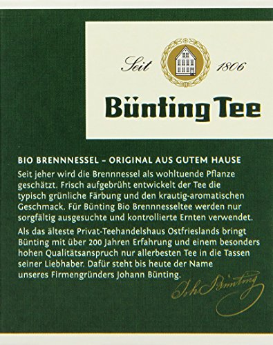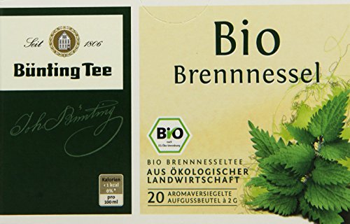 -. Binding : Lebensmittel & Getränke -. Brand : Bünting Tee -. EAN : 4008837223094 -. Feature : Ein Kräutertee aus der seit jeher als wohltuend geschätzten Pflanze / Frisch aufgebrüht entwickelt der Tee die typisch grünliche Färbung und den krautig-aromatischen Geschmack / Für die Bünting Bio-Teebeutel werden nur sorgfältig ausgesuchte und kontrollierte Ernten verwendet / aus ökologischer Landwirtschaft, nach EG-Öko-Verordnung / 20 aromaversiegelte Aufgussbeutel -. Label : Bünting Tee -. Manufacturer : Bünting Tee -. Model : 223094 -. MPN : 223094 -. NumberOfItems : 4 -. PackageQuantity : 4 -. PartNumber : 223094 -. ProductGroup : Grocery -. ProductTypeName : GROCERY -. Publisher : Bünting Tee -. Studio : Bünting Tee -. Title : Bünting Tee Bio Brennnessel 20 x 2g Beutel, 4er Pack (4 x 40 g)