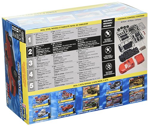 -. Binding : Toy -. Brand : Revell -. EAN : 0031445012334 -. Feature : Build your very own rugged go anywhere truck / Your child will boost their fine motor skills as they snap together the pre painted pieces and apply the decals, no paint or glue required / Kit includes Chrome wheels, Suspension details, separate pick up bed, full interior and sunroof -. Label : Revell -. Manufacturer : Revell -. Model : 85-1233 -. MPN : 85-1233 -. NumberOfItems : 49 -. PackageQuantity : 1 -. PartNumber : 85-1233 -. ProductGroup : Hobby -. ProductTypeName : TOYS_AND_GAMES -. Publisher : Revell -. ReleaseDate : 2017-05-01 -. Studio : Revell -. Title : Revell SnapTite Max Ford F-150 SVT Raptor Pick Up Model Kit -. UPC : 031445012334 -. Warranty : No Warranty