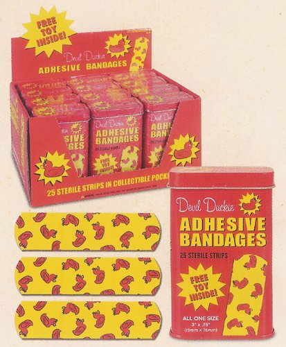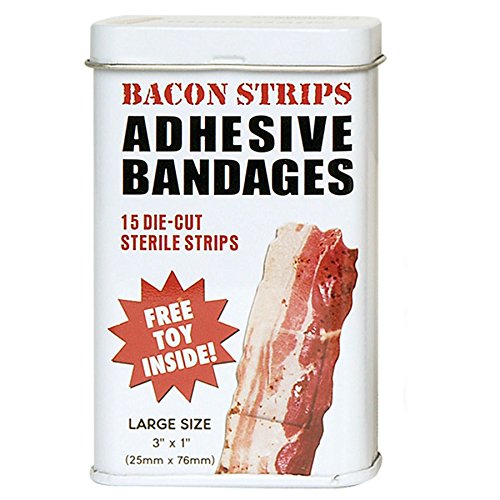 Ouch! That smarts! Treat your minor cuts, scrapes and scratches with the incredible healing power of meat. And if a fancy bandage isn't enough to dry up your tears, how about a FREE PRIZE! Each comes in a 3-3/4" tall metal pocket tin and contains a small trinket to help make even the ouchiest owies feel all better in no time. The 3" x 1" Bacon Strips are cut to look like small slabs of bacon. Fifteen per tin.Feature