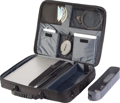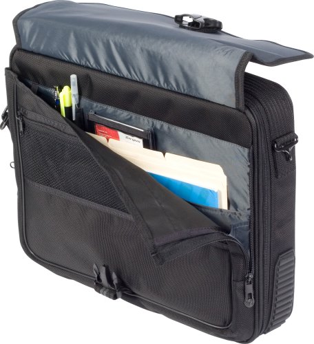 - Feature : Designed to accommodate laptops with up to 17 screens / Padded compartment protects the laptop, molded rubber-like tread at the bottom of the case helps prevent wear and tear and provides shock absorption / Front flap pocket allows for quick access to your airline ticket or passport / Includes a back slip pocket, pen loops, mesh pocket, key clip, card holder, 5 CD or DVD sleeves and 2 large mesh pockets for additional storage / Constructed of durable 1680D polyester with 330D nylon twill