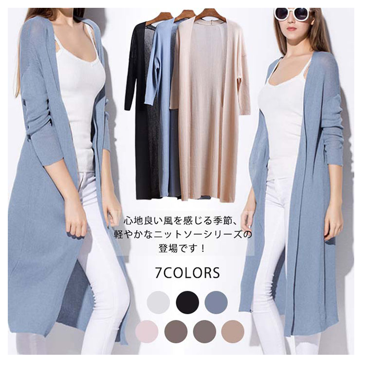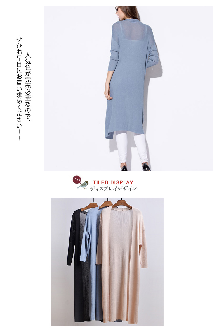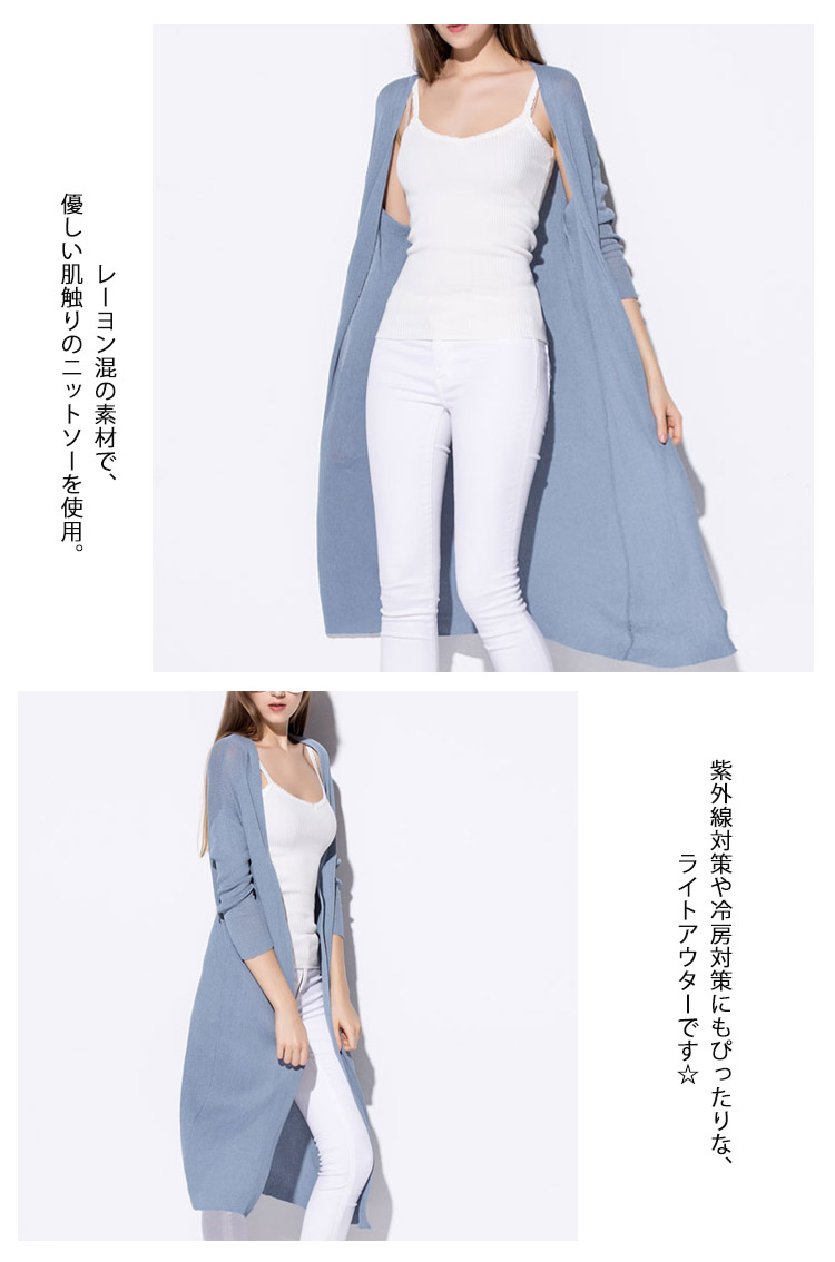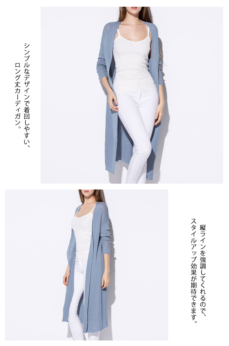 | 心地良い風を感じる季節、軽やかなニットソーシリーズの登場です!シンプルなデザインで着回しやすい、ロング丈カーディガン。縦ラインを強調してくれるので、スタイルアップ効果が期待できます。レーヨン混の素材で、優しい肌触りのニットソーを使用。紫外線対策や冷房対策にもぴったりな、ライトアウターです☆人気色が完売必至なので、ぜひお早目にお買い求めください!! | |
