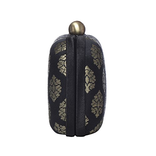 PRODUCT Description Monokrome New York is an Indian brand offering versatile bags for all occasions and age groups. Our team in New York works diligently to get you the fashion straight from the runways. All our products are value added/ hand crafted, exclusive, with Indian workmanship and global appeal. We are adorned with the people who value individuality, collectability and quality and the people constantly inspire us to create new shift in the essence of runway trends. We are fashion We are special We are abreast We are made in India MONOKROME NEW YORK Hemlock stylish Evening Hard case brocade/silk jacquard ethnic party black and gold clutch handbag with rich satin tonal lining handcrafted in India for women Exterior--Clutch exterior is made of woven silk brocade jacquard in off white and gold colour. Metal frame has been specifically covered in a tonal satin fabric to give it a value added and chic appeal. Interior-Interior- has been neatly finished with rich satin luxe lining .Has a Monokrome branded label. Inside volume is sufficient enough to carry a mobile phone/ credit cards/some liquid currency and makeup. Detachable metal chain strap- 55 cm long. Size- L X W X H -6 X 2 X 4 Inches / 16 X 5 X 10 cm MATERIALS Silk jacquard crafted Brocade-The front is covered with poly/silk/lurex blended jacquard. Strong and durable but not stain resistance. Keep the clutch stored in dust bag. DETAILS Size/Capacity- ergonomically designed easy to be clutched by your hand. Enough volume to carry an I phone/ credit cards , some liquid currency and some makeup. Superior hardware-frame is made from superior zamak alloy which is durable and strong, electroplated to resist rust, corrosion and tarnishing. Ensure safety-Clasp closure mechanism make sure that your valuables are secure.Feature