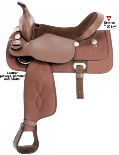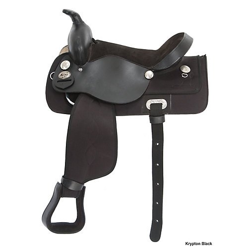 Studio : JACKS TACK (JTI) Publisher : JACKS TACK (JTI) Binding : Misc. Product Description Built on a reinforced fiberglass tree, the gracious styling of the King Series Krypton SyntheticWestern Saddle is sure to please. The tree is guaranteed for five years and the 4" cantle ensures a secure and comfortable ride. Features Cordura nylon synthetic skirts and fenders and handsome leather jockeys, pommel and cantle. Nylon tie straps, a reinforced stirrup bar, Blevins-style quick-change buckles, a back flank cinch, sliver billet slot and conchos, and a square skirt complete the package. Features: Scratch-resistant Cordura skirts and fenders Handsome leather jockeys, pommel and cantle Nylon tie straps Reinforced stirrup bar Blevins-style quick-change buckles Back flank cinch Silver billet slot and conchos Square skirt Item Specifications Sizes: 13" Youth, 14" Youth, 15", 16", 17" Colors: Pink, Turquoise, Black, Brown Bars: Full Quarter Horse Horn: 3" Cantle: 4" Swell: 12 1/2" Gullet: 8" Skirt: 27 1/2" x 28" x 1/2" 0
