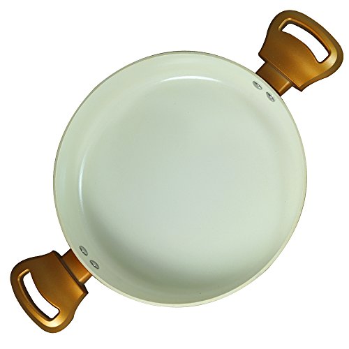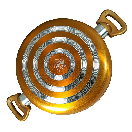 -. Feature : Metallic gold heat resistant exterior coating / Strong riveted easy-grip handle with thumb rest feature / Contoured body design / Durable and stylish! / Excellent heat conductivity and dispersion