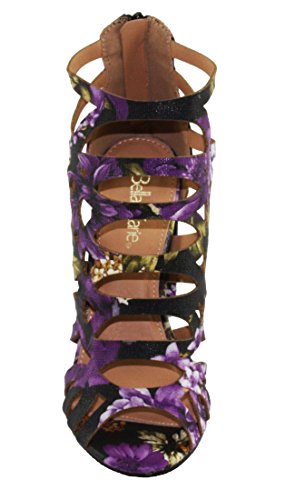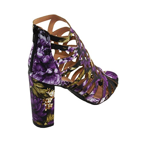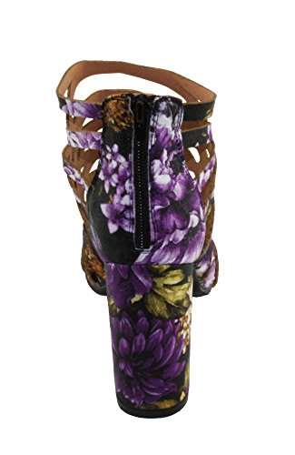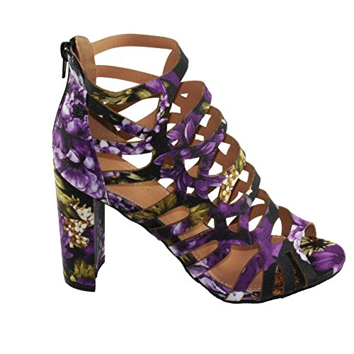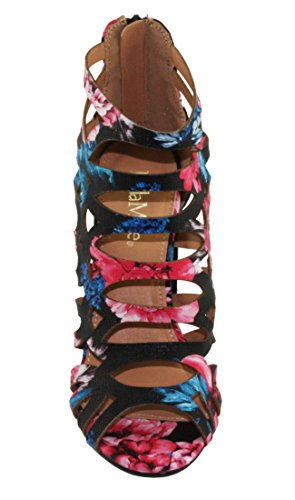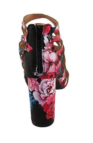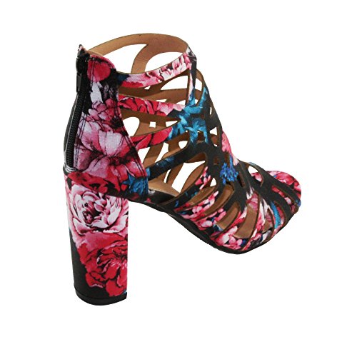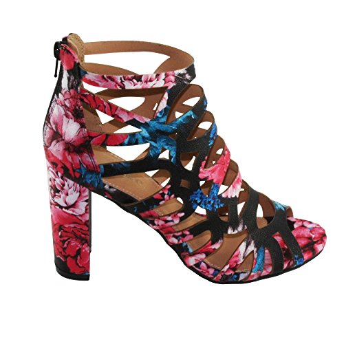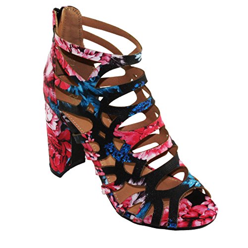 Product DescriptionWomen's Straps and geometric cutouts design, cage high heel sandals. floral print, back zip closure for easy on and off, round block heels.0