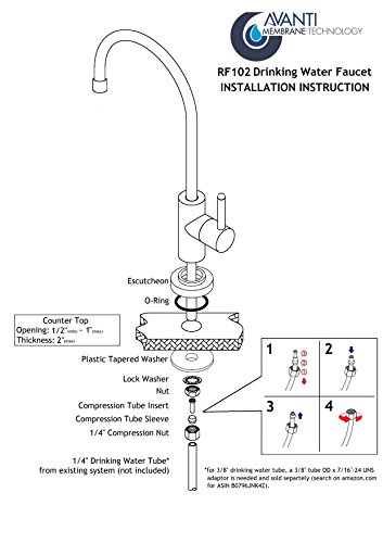 fits opening between 1/2” and 1”; fits countertop up to 2" thick; connected with 1/4” drinking water supply tube (not included); for 3/8" supply tube, a quick-connect adapter (ASIN B0796JNK4Z) is needed and sold separately