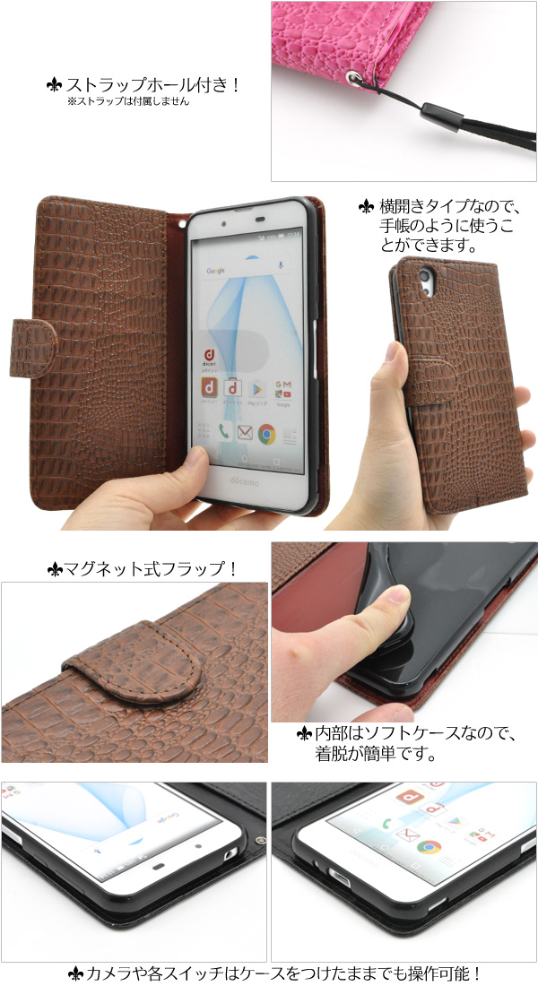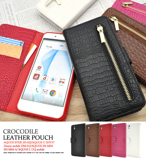 ファスナーポケット、カードポケット2つ、サイドポケット付き! AQUOS EVER SH-02J/AQUOS U SHV37 Disney mobile DM-01J/AQUOS SH-M04/SH-M04-A AQUOS L UQ mobile/L2 UQ mobile用 クロコダイルレザーデザインスタンドケースポーチ | | | |