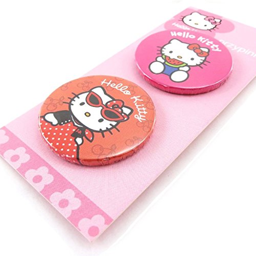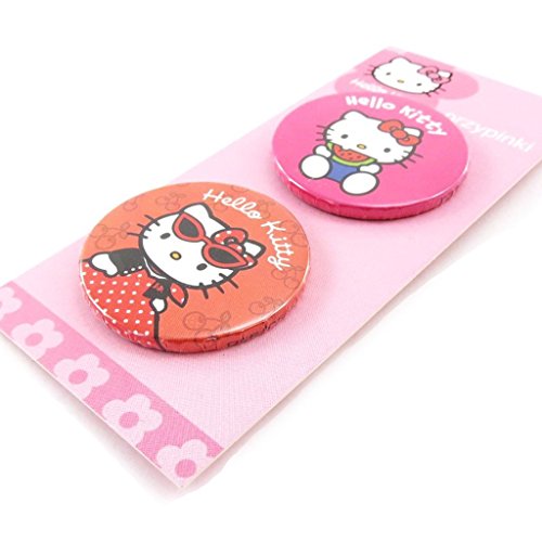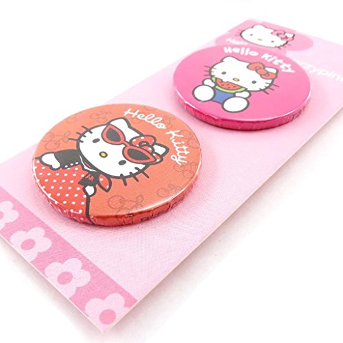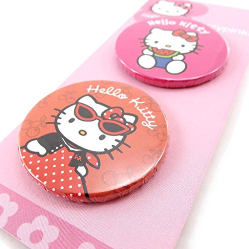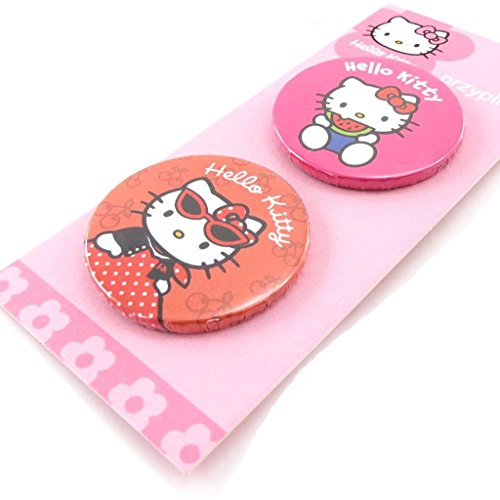 Set of two adorable badges 'Hello Kitty' of this little japanese cat that likes to customize her clothes, handbag or backpack... Metal, 3.7 cm (1.46'') diameter.