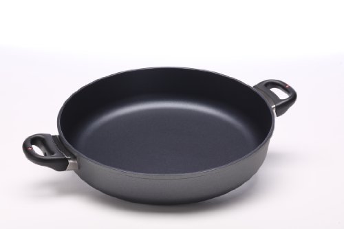 Creamy risotto, perfect paella - the Swiss Diamond sauteuse can start on the stovetop and finish in the oven. With a cooking depth of approx. 2.4 in, it is the perfect height for easy stirring and to fit on an oven rack. 4.8 qtr. (12.5" diameter). Includes lid. The included tempered glass lid allows you to monitor food without lifting the cover, maintaining flavor and keeping food from drying out. The rotating lid knob opens or closes a steam vent to release or contain moisture as needed. Used by discerning home chefs around the world, Swiss Diamond's PFOA-free cookware features unsurpassed nonstick performance for healthy cooking and easy clean-up. The patented nonstick coating, reinforced with real diamond particles, allows oil-free cooking and cleans up with just warm soapy water. No more scrubbing and soaking. Swiss Diamond's patented nonstick coating is reinforced with real diamonds for excellent durability and resilience. Why diamonds? Three reasons: they are durable, they are naturally nonstick and they conduct heat better than any metal. A perfect combination for a lifetime of cooking excellence. Swiss quality is visible in every aspect of Swiss Diamond cookware. Heavy-duty cast aluminum will never warp, while the perfectly flat base distributes heat evenly and will not tip or spin. The rivet-free interior prevents unsightly food build-up that can lead to bacterial growth. The ergonomic handle, designed for comfort and balance, stays cool on the stovetop. All Swiss Diamond products are oven-safe up to 500 degrees F (260 degrees C) and suitable for use on gas and electric cooktops – induction series sold separately. Made in Switzerland with an eco-friendly production process.Feature