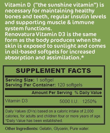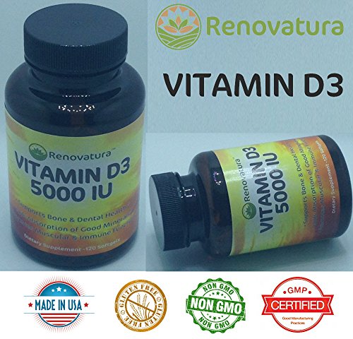 -. Binding : Health and Beauty -. Brand : Renovatura -. EAN : 0636655668533 -. Feature : Enjoy the Benefits of Vitamin D without Sun Exposure - Our formula provides the same biologically active form of vitamin D produced by the body as a result of sun exposure. Renovatura's Vitamin D3 in softgel form provides all the benefits of vitamin D without the risk of unprotected exposure to UV rays. / Supports Strong Bones & Healthy Teeth - Vitamin D3 is essential for improving calcium absorption, protecting your bones as you age and balancing phosphorus levels for healthy bones. / Vitamin D3 is known to naturally boost serotonin levels, the body's happy hormone, promoting a happier mood and overall well-being / Provides Immune Support - Researchers have found that Vitamin D boosts immune function. T cells rely on Vitamin D to be activated and fight invading viruses and bacteria / Made in the USA - Our vitamin D3 supplement is gluten-free and GMO-free. Each bottle contains a 120-day supply of Vitamin D3, 5,000 IU per softgel -. IsAdultProduct : 0 -. Label : Renovatura -. LegalDisclaimer : These statements have not been evaluated by the Food and Drug Administration. This product is not intended to diagnose, treat, or cure any disease. -. Manufacturer : Renovatura -. ProductGroup : Health and Beauty -. ProductTypeName : HEALTH_PERSONAL_CARE -. Publisher : Renovatura -. Studio : Renovatura -. Title : Renovatura Vitamin D3 5000 IU - 120 Softgels - Supports Healthy Bones & Muscles, Boosts Immune System -. UPC : 636655668533