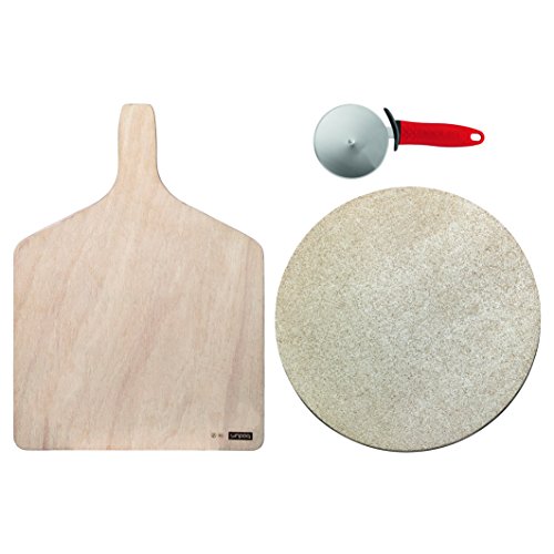 Bodum Bistro Pizza Set - Baking Stone, Wooden Cutting Board & Wheel Cutter with Red Handle