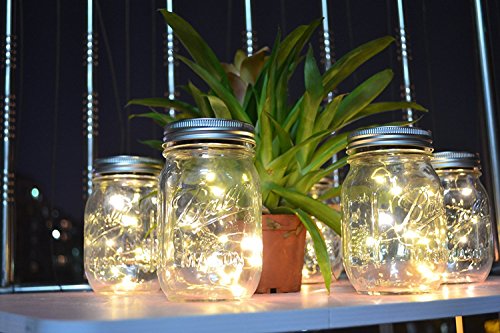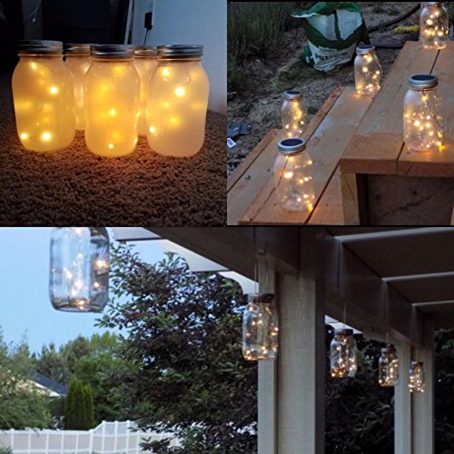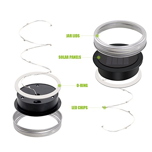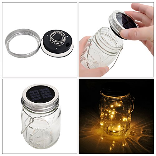 - 【Solar Mason Jar Lids Insert Light】Fits for most wide mouth mason jar, put the solar panels with string lights into the jar lids ring and turn the switch on, 10 LED warm white lights will light up during dark ambient(Mason Jar & Hanger Not Included)