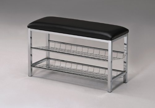 -. Feature : Materials: Leather, metal / Upholstery material: Bonded Leather / Upholstery color: Black ; Leg color: Chrome / Two-tier of shoe storage / Dimensions: 19 inches high x 32 inches long x 12 inches deep