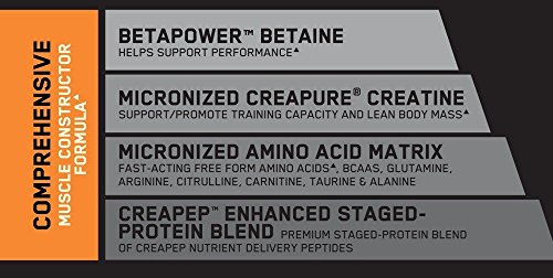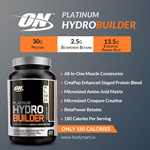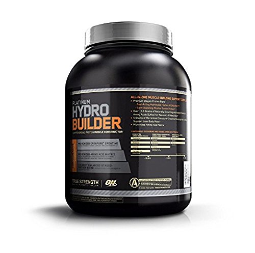 ON's Most Comprehensive Muscle Recovery Formula. Muscles aren't built bigger and stronger during sets of heavy reps. That effort actually breaks muscle fibers down. Sizable gains are made during the recovery that follows weight training. Kick-start your recovery with Platinum Hydrobuilder - ON's advanced all-in-one muscle builder. Built on a foundation of premium blended proteins enhanced with CreaPep peptides, ON included 2.5 grams of BetaPower Betaine and 5 grams of Creapure Creatine to complement an amino acid matrix that includes 13.5 grams of naturally occurring and added Essential Amino Acids. You'll be surprised how rich and creamy each 180 calorie shake tastes. Beyond The Basics All-In-One muscle supporting formula with 30 grams of fast & slow digesting proteins and a matrix of micronized amino acids. Includes Micronized Creapure Creatine Monohydrate at just 180 calories per serving. These statements have not been evaluated by the Food and Drug Administration. This product is not intended to diagnose, treat, cure, or prevent any disease.Feature