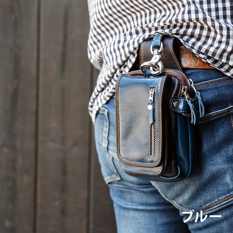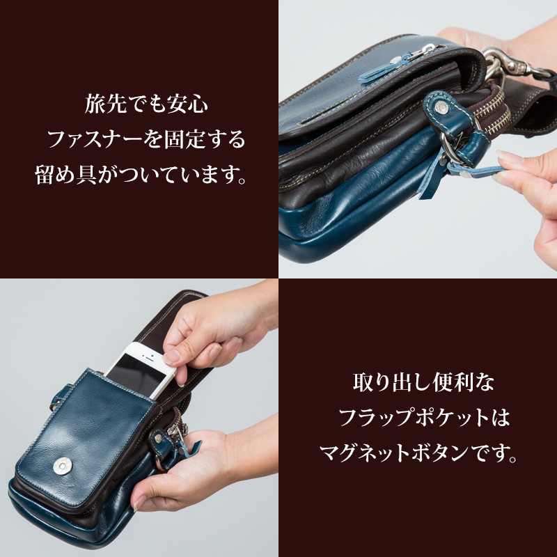 独特の艶と輝きを放つイタリアンレザー細部に至るまで丹念に丁寧に仕上げが施されています。普段持ち歩く財布、スマートフォン、車のキーや手帳、等の小物を収納してスタイリッシュに持ち運びできます。 【サイズ】 高さ=約21.5Cm 幅=約12.0Cm マチ=6.0Cm【素材】 牛革 ポケット裏:ポリエステル生地 金具:合金【カラー】 レッド・ブルー【脱着】カシメで留められていますのでベルトを通してから着用して下さい。 一流革職人がハンドメイドで仕上げらてた     本革ヒップバッグ&ショルダーバッグ。Deep Zone ワイルドでセクシーを上品にまとめる男のヒップバッグ自分買いからプレゼントにも人気。レベルトポーチ ヒップバッグ ウエストバッグ ウエストポーチ メンズ 本革
