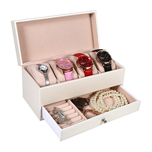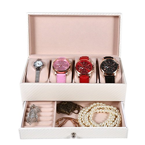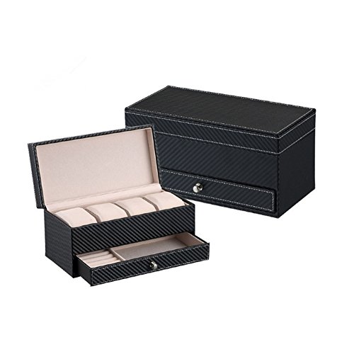-. Feature : Material: Carbon Fiber Leather + Bead Fleece / Size(L x W x H): Approx. 8.8inch x 4.2inch x 4.3inch / Our watch box has a fashionable design and elegant appearance, it is perfect for collecting your watches or jewelry in your home or using as a great gift to your friends. / Total 4 slots are enough to collect watches for daily use, and the drawer could help you to collect your rings, earrings, necklaces, bracelets and so on, really practical and convenient to use. / Package Includes: 1 x Leather Watch Box with Drawer (Watches and other jewelry are not included)