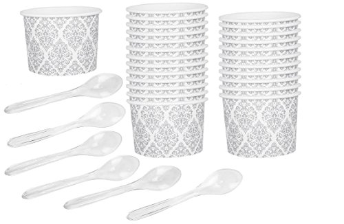 Outside the Box Papers Ice Cream Sundae Kit- 12 Ounce Silver Damask Paper Cups and Clear Plastic Spoons - 16 Each
